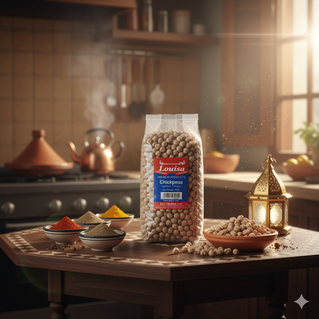Louisa Premium Chickpeas are carefully selected for their size, quality, and clean flavor. These chickpeas become tender and creamy once cooked, making them perfect for traditional Moroccan dishes such as حمص معمر, الحريرة, stews, salads, and even homemade hummus.