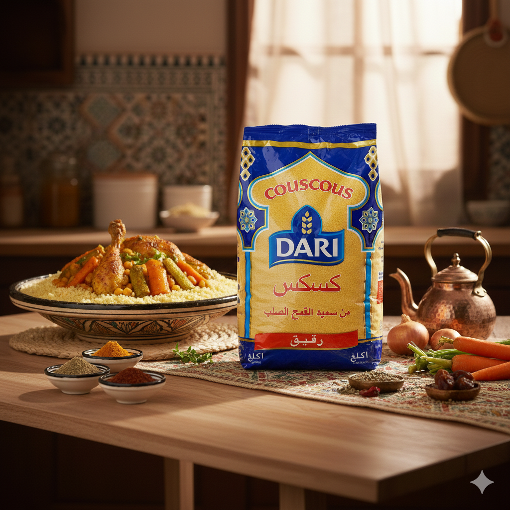 Dari Fine Couscous is one of Morocco’s most trusted and widely used couscous varieties. Made from high-quality durum wheat semolina, it delivers a light, fluffy texture that cooks quickly and pairs perfectly with traditional Moroccan dishes. Whether you’re preparing a classic couscous with vegetables, serving it as a side dish, or using it for modern recipes, Dari guarantees consistent quality and exceptional taste.