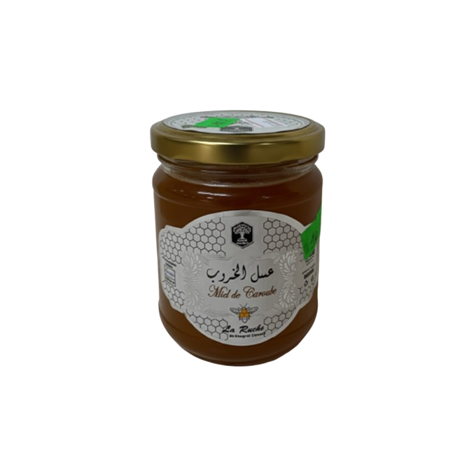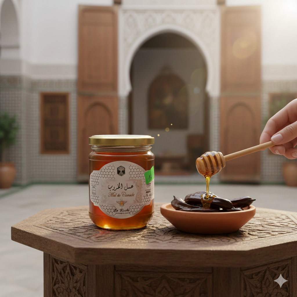 La Ruche Carob Honey is a rich, aromatic Moroccan honey crafted from the blossoms of the carob tree (خروب), known for its deep, caramel-like flavour and smooth texture. Naturally dark and full-bodied, this honey is cherished for both its taste and traditional benefits.