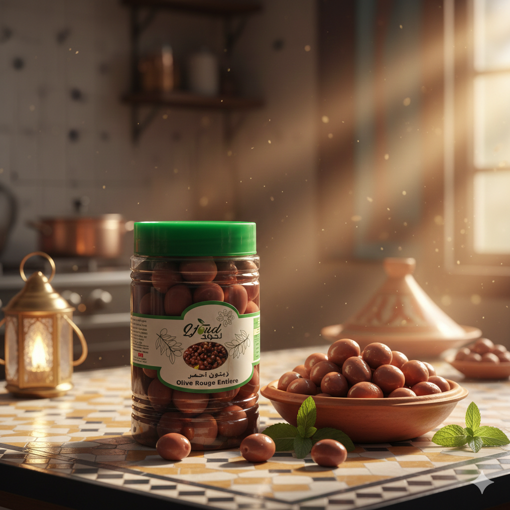 Ljoud Red Olives offer a unique, naturally brined flavor with a firm texture and a beautiful reddish tone. These olives are selected from quality Moroccan harvests and prepared using traditional methods, giving them their distinct color and mildly tangy taste.