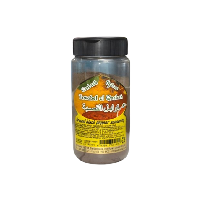 Tawabel Al Qasbah Ground Black Pepper is a high-quality finely ground black pepper used in Moroccan and international cuisine. Known locally as إبزار مطحون, this essential spice adds warmth, depth, and gentle heat to a wide variety of dishes.